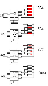 При повороте рукоятки на 90° по часовой стрелке (положение рукоятки "1") все нагревательные элементы оказываются включенными в электросеть последовательно, а нагрев будет слабым. При установлении рукоятки в положение "2" одна часть нагревательных элементов будет обесточена, а другая включена, что приведет к снятию половины мощности (средний нагрев). При переводе рукоятки в положение "3" все нагревательные элементы будут включены параллельно, что дает максимальный нагрев. Таким образом, соотношение мощностей приемника будет 4:2:1.